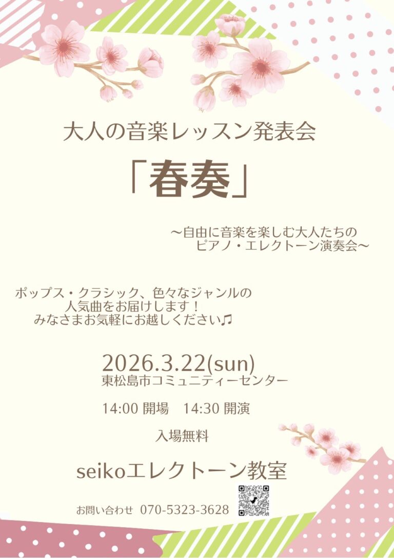 IMG_6210 大人の音楽レッスン~ 2025年度の締めくくり 大人の音楽レッスン発表会「春奏」 2026.3.22(日) 14:00 開場 14:30 開演 東松島コミュニティセンター 色んなドラマがあ